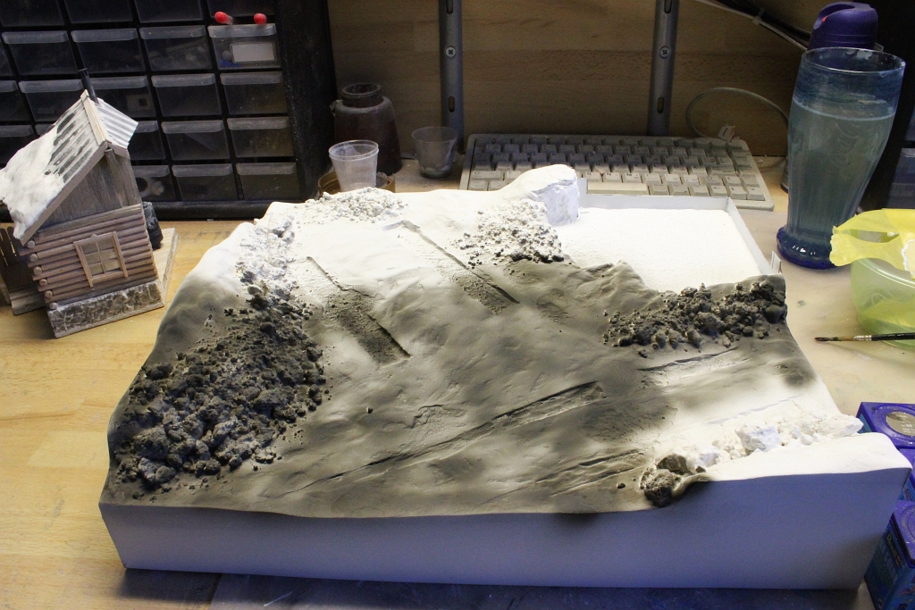 I finished the sanding of the base and startet painting. Everything was painted black, to get more depth. After that, everything got his first white-paint. Also the little blockhouse got his coat of dark-brown.